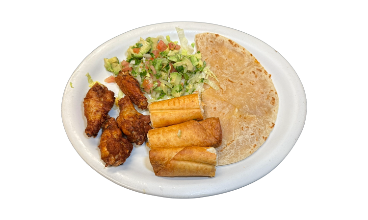 Quesadillas, Los Arcos Chile Dip, Mini Burritos Fritos, and Wings (with sour cream and guacamole) 15.95