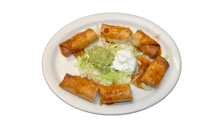 Six deep-fried mini burritos, your choice of chicken or picadillo, served with sour cream, guacamole, and ranchero sauce. $12.75
