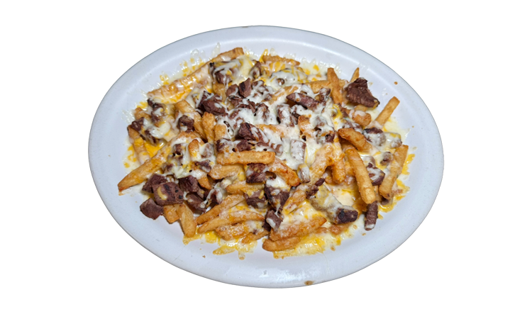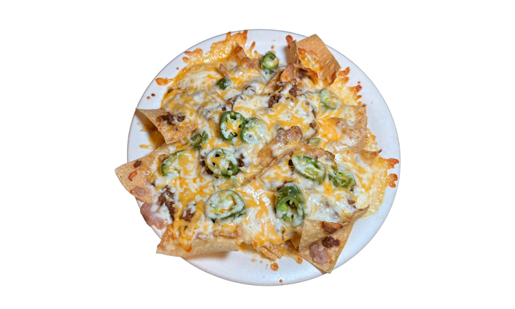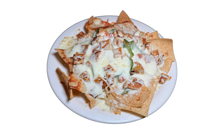 Tortilla chips with charbroiled top sirloin or chicken breast strips, onions, tomatoes, bell peppers, and cheese.