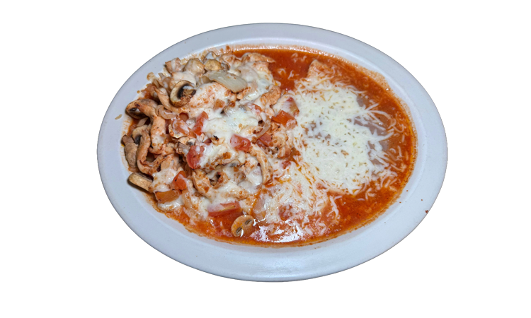 Pan-broiled slices of chicken breast, roasted garlic, mushrooms, onions, and tomatoes, topped with melted cheese and served over rice. (In a sauce) $19.95