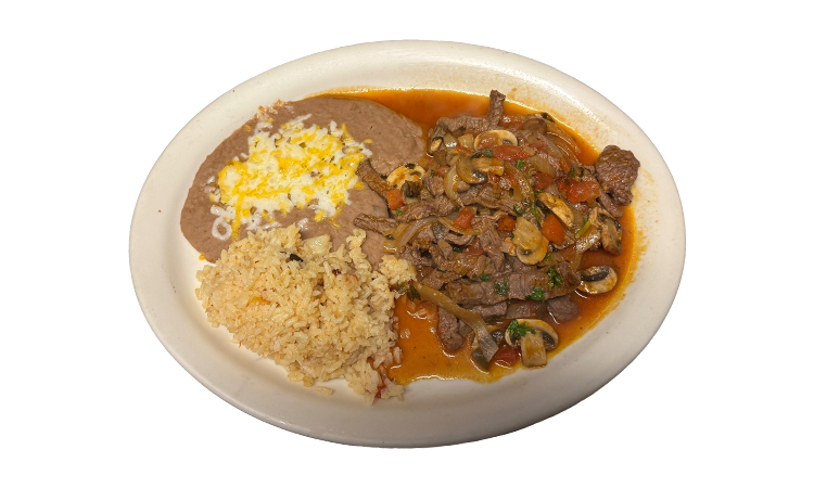With your choice of steak, chicken breast, or pork, marinated in beer, Mexican spices, onions, tomatoes, mushrooms, and cilantro. (1n a sauce) $18.95