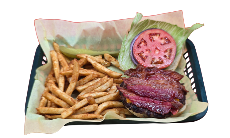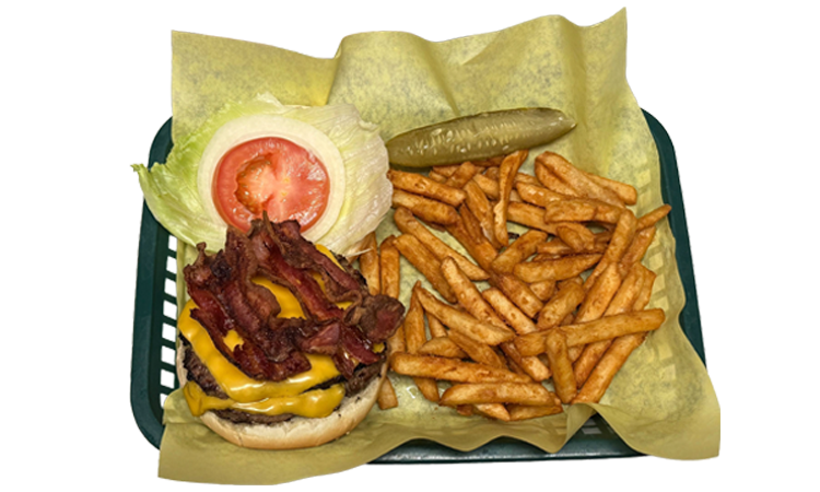 Two all natural 1/3 pound burger topped with American cheese and bacon served with lettuce, tomato, onion, and mayonnaise.