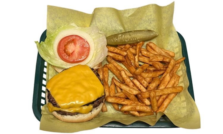Two all natural 1/3 pound burgers topped with American cheese served with lettuce, tomato, onion, and mayonnaise.