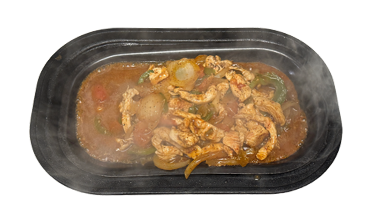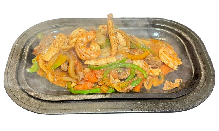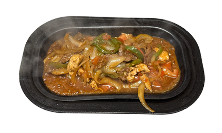 Marinated tender steak or chicken strips sautéed and simmered with roasted garlic, onions, tomatoes, and bell peppers. Served sizzling hot to your table with rice, beans, Pico de Gallo, guacamole, Sour cream, and homemade tortillas.