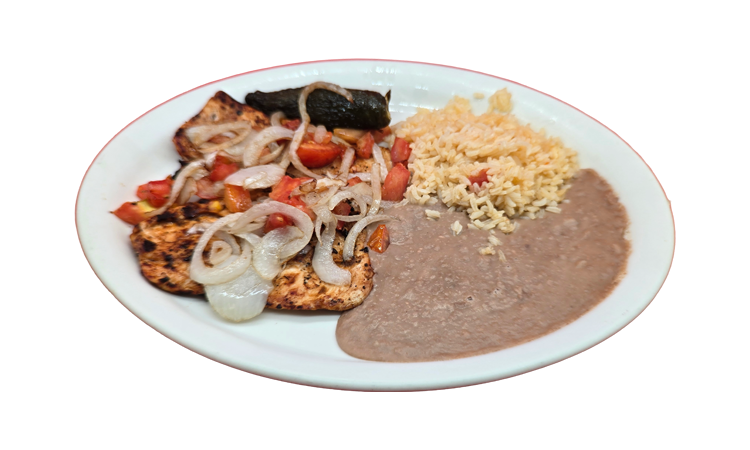 An 8-oz grilled breast with jalapeños, onions, and tomatoes. $15.95