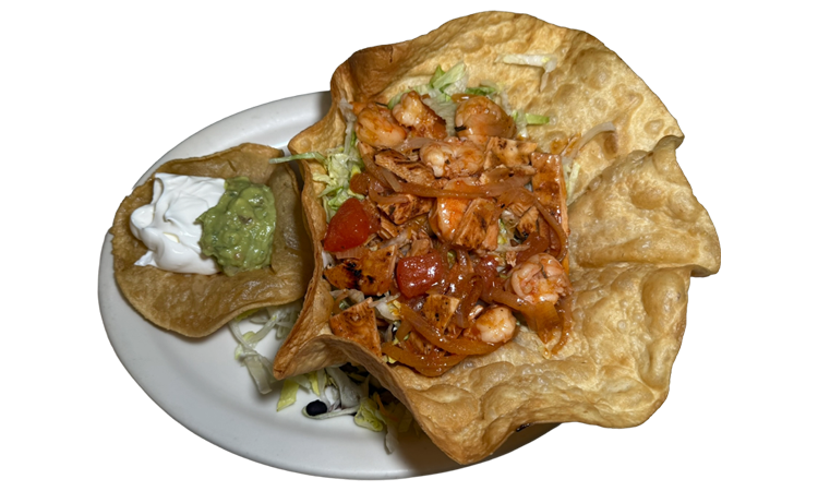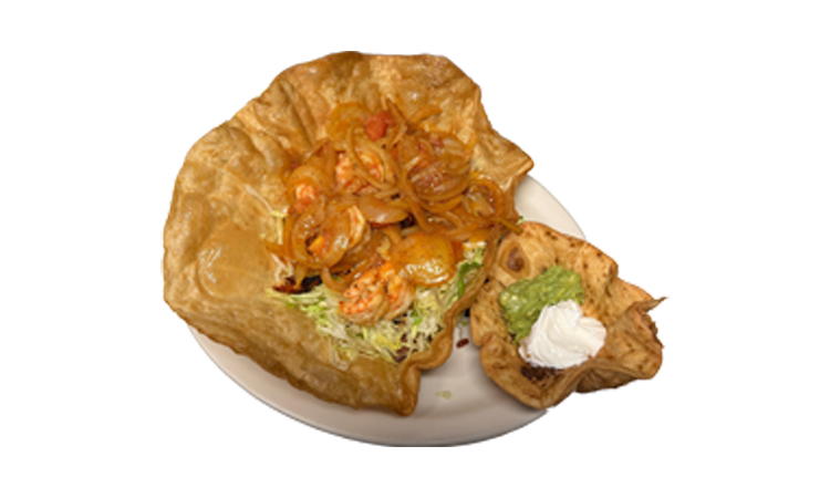 A 14” flour tortilla basket filled with black beans, melted cheese, lettuce, sautéed shrimp, onions, tomatoes, charbroiled chicken breast, sour cream and guacamole. $18.95